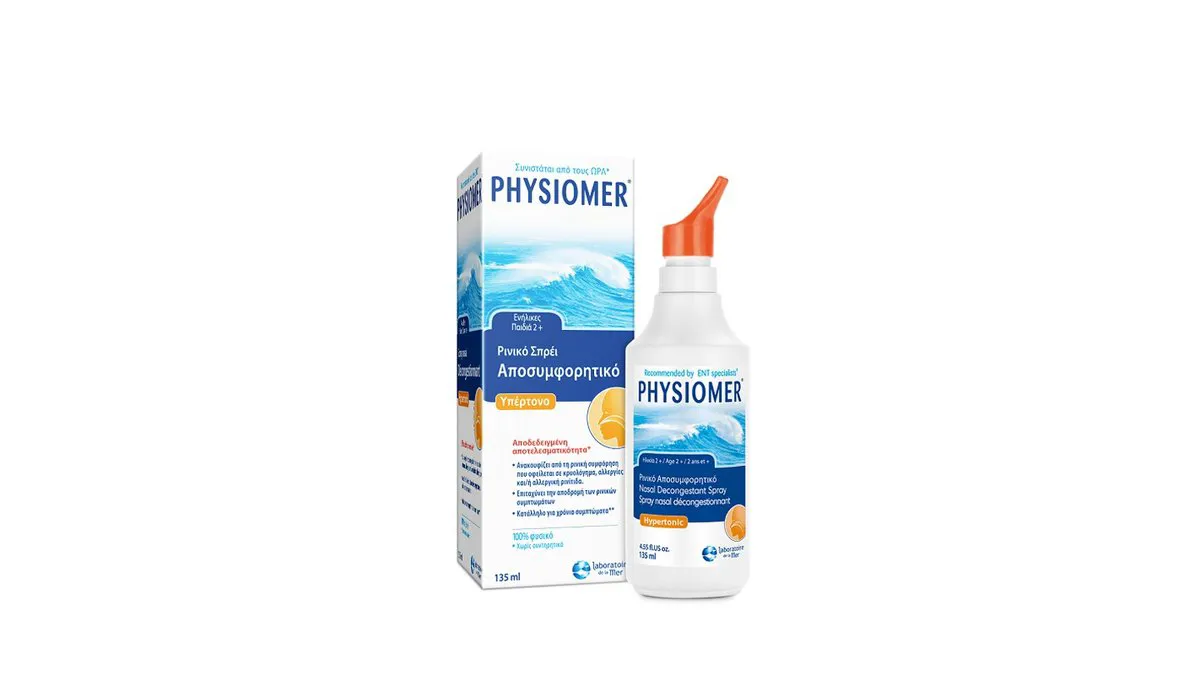 Συνιστάται από τους ΩΡΛ* Για ενήλικες και παιδιά 2+ ετών Το Physiomer Υπέρτονο είναι ένα φυσικό ρινικό αποσυμφορητικό που συμβάλλει στον αποτελεσματικό καθαρισμό των ρινικών οδών και στην αποκατάσταση της αναπνοής. Δεν προκαλεί εξάρτηση και είναι μία αποτελεσματική εναλλακτική έναντι των φαρμακευτικών αποσυμφορητικών σκευασμάτων για την ανακούφιση της ρινικής συμφόρησης. Ενδείκνυται για: