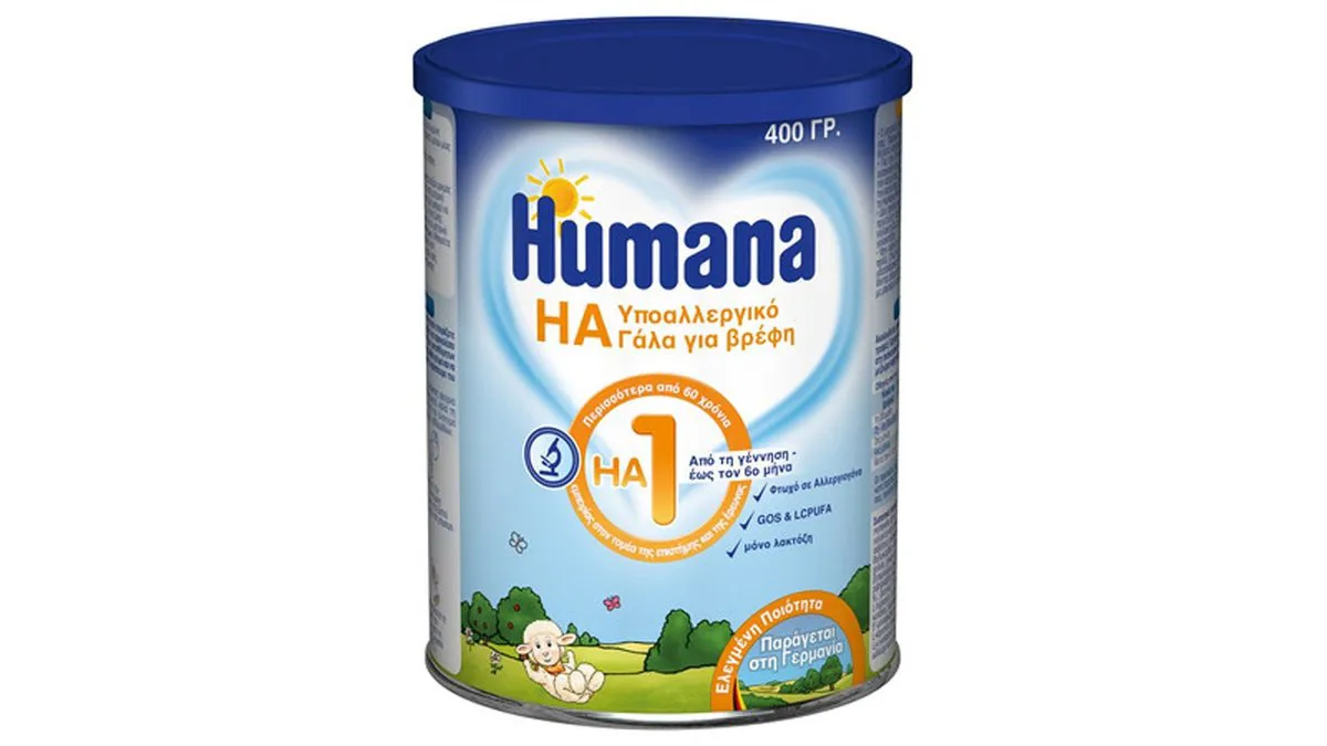 Υποαλλεργικό Γάλα για Βρέφη Humana HA 1 Υποαλλεργική τροφή για μωρά με αυξημένο κίνδυνο εμφάνισης αλλεργίας Χρήση του Humana HA 1: Το Humana HA 1 είναι η υποαλλεργική τροφή πρώτης βρεφικής ηλικίας για μωρά με αυξημένο κίνδυνο εμφάνισης αλλεργίας, που μπορεί να χρησιμοποιηθεί αμέσως μετά τον τοκετό: – ως αποκλειστική τροφή, αν δεν θηλάζετε – ως συμπλήρωμα στο θηλασμό – σε συνδυασμό με το θηλασμό Ιδιότητες: – χορταστικό και εύπεπτο – μερικώς υδρολυμένη πρωτεΐνη ορού γάλακτος – 100% φυτικά λίπη πλούσια σε ω3 και ω6 απαραίτητα λιπαρά οξέα – χωρίς σακχαρόζη – εμπλουτισμένο με σίδηρο – χωρίς γλουτένη Σημαντική σημείωση: Ο θηλασμός είναι το καλύτερο για το παιδί σας. Αν θέλετε να χρησιμοποιήσετε μια βρεφική τροφή από την πρώτη βρεφική ηλικία, συμβουλευθείτε πρώτα τον παιδίατρο ή την κλινική σας. Παρακαλούμε, λάβετε υπόψη τις υποδείξεις και τις οδηγίες της συσκευασίας.
