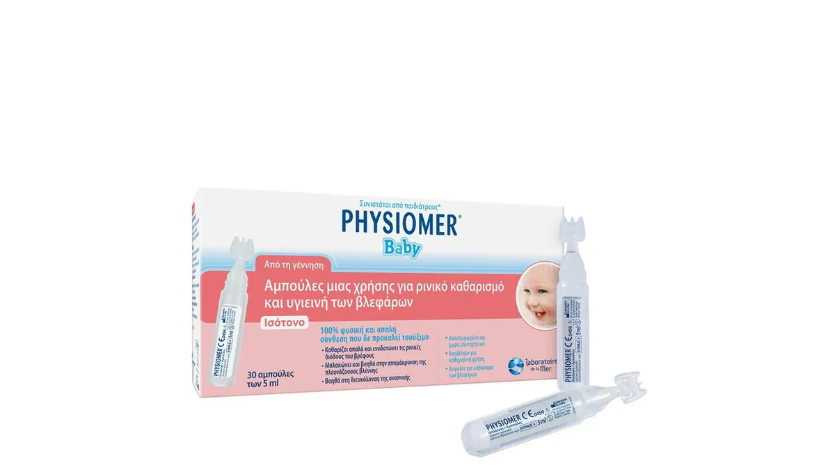 Ρινικός καθαρισμός & Υγιεινή των βλεφάρων Συνίσταται από Παιδιάτρους*, χρήση από τη γέννηση Οι Αμπούλες μιας χρήσης Physiomer® Βaby είναι πρακτικές και εύκολες στη χρήση και βοηθούν στον καθαρισμό και την ενυδάτωση της μικροσκοπικής μυτούλας, των ρουθουνιών και των βλεφάρων του μωρού σας! Με 100% θαλασσινό νερό, οι Αμπούλες ® Physiomer Baby ενδείκνυνται για την ανακούφιση του μωρού σας κατά τη διάρκεια του κρυολογήματος και των λοιμώξεων του ανώτερου αναπνευστικού. Βελτιώνουν την αναπνοή και συνεπακόλουθα τον ύπνο και τη σίτιση του μωρού σας. Γνωρίζατε ότι τα μωρά επηρεάζονται ιδιαίτερα όταν υποφέρουν από ρινική συμφόρηση ή πλεονάζουσα βλέννα καθώς δεν έχουν μάθει ακόμα να φυσούν τη μύτη τους; Οι Αμπούλες Physiomer ® καθαρίζουν απαλά τις ρινικές διόδους του μωρού σας και συμβάλλουν στην πρόληψη πιθανών επιπλοκών στα αυτιά και τις αναπνευστικές οδούς. Σε αντίθεση με τις συμβατικές αμπούλες φυσιολογικού ορού: Οι Αμπούλες Physiomer® Baby περιέχουν 100% αδιάλυτο θαλασσινό νερό: χάρη στην αποκλειστική διαδικασία παραγωγής του, το Physiomer διατηρεί τον πλούτο των μεταλλικών στοιχείων του θαλασσινού νερού. Το Physiomer® έχει κλινικά αποδεδειγμένη αποτελεσματικότητα και έχει αποδειχθεί ότι είναι ανώτερο από τα απλά αλατούχα διαλύματα** Ενδείκνυται για: · Καθημερινή υγιεινή · Καθαρισμός των βλεφάρων · Κρυολόγημα · Ρινοφαρυγγίτιδα ΚΑΘΗΜΕΡΙΝΗ ΥΓΙΕΙΝΗ ΚΑΙ ΠΡΟΛΗΨΗ: • Καθαρίζει απαλά και ενυδατώνει τις ρινικές διόδους του βρέφους • Μαλακώνει και βοηθά στην απομάκρυνση της πλεονάζουσας βλέννης • Βοηθά στην διευκόλυνση της αναπνοής • Συμβάλλει στην απομάκρυνση των αλλεργιογόνων (σκόνη, γύρη), των ιών, των βακτηρίων και των ρύπων • Συμβάλλει στην πρόληψη εμφάνισης ΩΡΛ επιπλοκών (πχ. ωτίτιδα) ΑΝΤΙΜΕΤΩΠΙΣΗ • Ανακουφίζει το μωρό κατά τη διάρκεια του κρυολογήματος και των λοιμώξεων του ανώτερου αναπνευστικού. • Βελτιώνει την αναπνοή και συνεπακόλουθα τον ύπνο και τη σίτιση του μωρού σας.