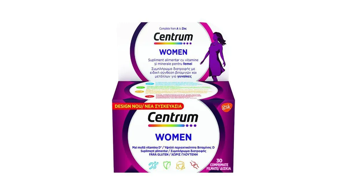 Σύνθεση ειδικά σχεδιασμένη για να καλύπτει τις διατροφικές ανάγκες της γυναίκας Οι γυναίκες έχουν διαφορετικές διατροφικές ανάγκες από τους άνδρες. Θρεπτικά συστατικά όπως το ασβέστιο, ο σίδηρος και το φυλλικό οξύ παίζουν ιδιαίτερα σημαντικό ρόλο στη διατήρηση της φυσιολογικής λειτουργίας του γυναικείου οργανισμού, γι’ αυτό περιέχονται στη σύνθεση του Centrum Women: Το ασβέστιο είναι απαραίτητο για τη διατήρηση της φυσιολογικής κατάστασης των οστών. Ο σίδηρος συμβάλλει στο φυσιολογικό σχηματισμό των ερυθρών αιμοσφαιρίων και της αιμοσφαιρίνης. Το φυλλικό οξύ υποστηρίζει τη διαδικασία της κυτταρικής διαίρεσης. Η πρόσληψη ασβεστίου είναι σημαντική για την ανάπτυξη των οστών. Για αυτό το λόγο, το ασβέστιο είναι απαραίτητο για την υγιή ανάπτυξη των παιδιών και την υγιή ανάπτυξη των οστών τους. Λόγω του εμμηνορυσιακού κύκλου (κύκλος περιόδου), οι γυναίκες επίσης χρειάζονται πολύ περισσότερη ποσότητα σιδήρου για την ενίσχυση του φυσιολογικού σχηματισμού των ερυθρών αιμοσφαιρίων. Το φυλλικό οξύ είναι απαραίτητο κατά την αναπαραγωγική περίοδο, δεδομένου ότι συμβάλλει στη φυσιολογική αιμοποίηση, την κυτταρική διαίρεση και την ανάπτυξη του μητρικού ιστού κατά την εγκυμοσύνη. Χρήση: Λαμβάνετε 1 δισκίο την ημέρα με νερό. Εάν είναι απαραίτητο, μπορείτε να σπάσετε το δισκίο σε δύο κομμάτια.